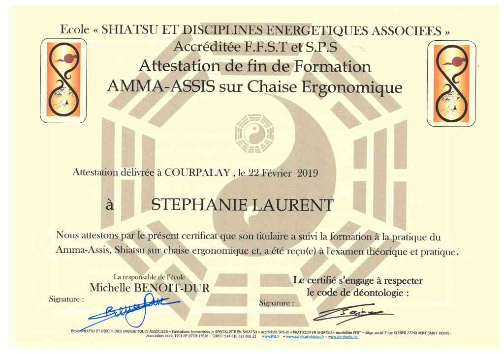 - 2019 : Certification en AMMA-ASSIS = Shiatsu sur chaise ergonomique (2 jours).