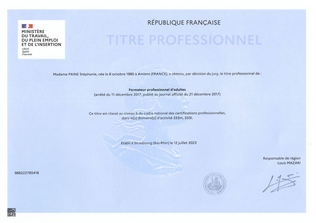 - Juillet 2023 : Titre professionnel de Formatrice Professionnelle d’Adultes chez ISTAS (6 mois).